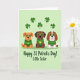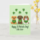 The front design shows three stylized dogs standing close together in a neat row on a soft green background, their matching bright green glasses giving them a sweet, friendly togetherness 💚. An orange pup wears a green sweater dotted with shamrocks, leaning slightly toward the others as if posing for a photo. Beside it, a chocolate-brown dog sports a green bandana, its relaxed stance and gentle expression suggesting an easy bond with the group. On the other side, a brown-and-white beagle-type dog wears a striped green jumper, angled in a way that makes the trio feel like close pals sharing the moment ☘️. Five dark green shamrocks float across the upper area, spaced evenly like simple decorations hanging overhead. Near the bottom, dark green lettering reads “Happy St Patrick’s Day! Little Sister,” centered and set low against the green field. Small yellow shamrock accents sit around the dogs and clothing details, adding warm contrast to the greens.