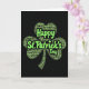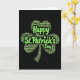 This card features a shamrock shape built entirely from lime-green words on a deep black background, creating a striking night-glow look ☘️. At the center, “Happy St. Patrick’s Day” appears in larger green lettering, anchoring the clover like a shared toast between close friends. The surrounding smaller text forms the leaves and curves, with scattered odd terms such as “Almans,” “Justico,” and “Govendullbey” adding a layered, puzzle-like texture. The contrast makes the green type look almost lit from within, as if the clover is hovering in the dark. A tiny four-leaf clover icon sits near the main message, tucked in like a little lucky wink 💚. The overall layout feels modern and festive while still keeping the focus on the central greeting. The shamrock’s edges are defined by dense, tightly packed micro-words that taper into crisp points and rounded lobes.