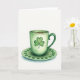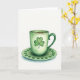 This card features a green teacup and saucer centered on a bright white background, with Irish details that feel like a shared little treat between close friends 💚. The cup has a soft, watercolor-like texture, and a three-leaf shamrock sits right on its front, shaded in several emerald tones that make it look gently rounded. Along the rim and the curved handle, a scalloped trim like tiny pearls adds a dainty touch, echoed again around the saucer’s edge. Inside the cup, dark brown tea creates a cozy contrast, as if it’s been poured for two to linger over. The saucer is decorated with a ring of small repeating shamrocks and a neat center pattern of concentric circles that hints at Celtic knotwork. There’s no text on the front, so the illustration stays uncluttered and easy to take in, with one small ☘️ detail carrying the whole message visually. Even, soft lighting keeps the greens smooth and layered, and the cup-and-saucer set sits squarely in the middle with plenty of white space all around.