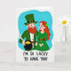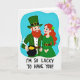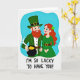 This greeting card shows a cheerful bearded man in a green leprechaun suit and tall top hat, holding a black pot brimming with shiny gold coins ☘️. Beside him stands a smiling woman with long red hair and a small green flower tucked near her temple, wearing a green dress with a gold buckle that echoes his outfit 💚. They lean slightly toward each other, meeting eyes with an easy, affectionate look that reads like close friendship or romance. The pair sits centered on a soft blue background that fades into a wide white area, giving the scene room to breathe. Across that white space, the message “I’M SO LUCKY TO HAVE YOU!” appears in large uppercase letters, set in a dark green tone for strong contrast. The man’s rosy cheeks and the woman’s bright eyes add a gentle, cared-for feeling to their expressions. Gold coins spill upward from the pot in small arcs, catching light against the blue behind them. The green clothing, black pot, and scattered gold sit crisply against the blue-to-white backdrop, with the text positioned prominently to the right.