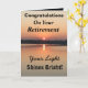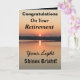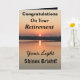 Exprimez vos vœux pour une retraite heureuse sur une carte de soleil couchant inspirante avec le verset “Votre lumière brille”. Le design minimaliste est moderne avec des couleurs audacieuses d'or et de noir montrant de l'eau scintillante et un lac paisible. Félicitations pour de nombreuses années heureuses !