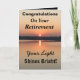 Exprimez vos vœux pour une retraite heureuse sur une carte de soleil couchant inspirante avec le verset « Votre lumière brille ». Le design minimaliste est moderne avec des couleurs audacieuses d'or et de noir montrant de l'eau scintillante et un lac paisible. Félicitations pour de nombreuses années heureuses !