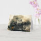 Cette carte blanche présente un collage numérique d'une machine à écrire manuelle vintage avec des fleurs et une tasse de café, sur un arrière - plan d'aquarelle sépia.