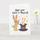 This greeting card features two cute bunny-like characters on a white background, sharing a sweet, friendly moment 🐰. On the left, a light brown character with rosy cheeks holds a thin black wand, and a few curling gray wisps rise from its tip as if a trick was just finished. Its round face and gentle eyes angle toward its companion, giving the scene a tender, “look what I did for you” kind of warmth. On the right, a bright white character pops up from a tall cylinder hat with alternating purple and green stripes, lifting one arm in an inviting wave 🐇. A small blue bow tie sits neatly at its neck, and its open, happy expression faces the brown character like it’s reacting with delighted affection. Scattered around them are golden-yellow stars in different sizes, floating in the open space to frame the pair. At the top, a short seasonal greeting appears in dark lettering, centered above the illustration, with the stars sprinkled between the text and the characters. The hat’s purple and green stripes stand out sharply against the white background, with the white character rising from the opening.