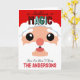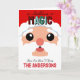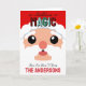 Salutations de saison avec cette carte Père Noël mignonne. Un grand visage heureux Père Noël avec des yeux de bouton noir et un nez de bouton rose, une grande barbe moelleuse et un casquette rouge avec une garniture blanche. En haut de la carte on peut lire "Noël" (en noir) et en dessous, "magie" (en rouge et vert). Au bas de la carte, on peut lire "de notre maison à la vôtre" (en texte noir) et un modèle pour ajouter votre nom de famille en texte rouge.