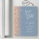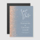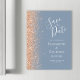 Le bord gauche de ce mariage moderne élégant, sauf la date carte magnétique comporte une bordure en faux parties scintillant pêche. Le texte personnalisable combine écriture manuscrite blanche, copperplate et polices italiques sur un arrière - plan bleu poussiéreux.