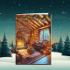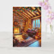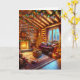 Nous vous souhaitons un Noël chaleureux et convivial à l'ancienne et une Bonne Année. Le texte au dos de la carte postale peut être personnalisé, vous pouvez donc ajouter votre nom si vous le souhaitez ou modifier le message. Salon de maison de campagne en rondins chaleureuse et confortable avec cheminée la veille de Noël rempli de décorations de fêtes, de couronnes de Noël et de lumières de Noël.
