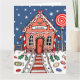 A colourful illustration of a consolive gingerbread house. The outside of the house is decorated with two candy canes and has a large lollipop tree in the garden. The ground is covered in bright white icing sugar snow and strewn with sweets.
