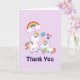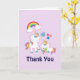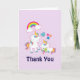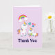 Carte de remerciement mignonne avec une licorne maman blanche avec une crinière et une queue colorées fantaisistes. Un bébé licorne allongé à côté d'elle, avec une tétine verte dans la bouche. Un arc-en-ciel coloré avec des nuages duveteux, et quelques étoiles et un cœur décorent ce design doux et adorable. Un contour rose gras entourant l'image lui donne une vibe de gribouillage enfantin. Fond violet clair.