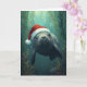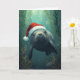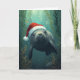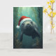 Cette carte de Noël fantaisiste présente un adorable manat nageant gracieusement sous l'eau, portant un chapeau de Père Noël festif. Entouré d'algues, de coraux et de bulles, ce design mêle la magie de l'océan à la joie des fêtes. Idéal pour les amateurs de lamantins, les passionnés d'océan et tous ceux qui aiment une touche côtière unique sur les traditions de Noël.