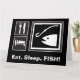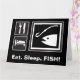 Graphiques de style panneau noir, blanc et gris représentant les nécessités de la vie. Petites icônes pour manger et dormir utilisant le couteau et la fourchette standard de service de nourriture, et les photos de toit et de lit de l'hébergement motel. Graphique de PÊCHE extra grand montrant une tête de poisson et un hameçon de pêche, parce que bien sûr la pêche importe plus que manger et dormir! Videz à l'intérieur pour votre propre message manuscrit personnel, et assez grand pour que plusieurs personnes puissent signer. Idéal pour des occasions spéciales comme les anniversaires ou les retraites.