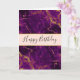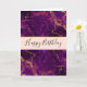 Une carte de voeux d'anniversaire avec une belle motif abstraite au design marbré. Des couleurs violettes riches se mélangent avec des rubans tourbillonnants d'or faux, mélangeant et mélangeant les couleurs tout au long du design. Une couche de couleur pêche au centre avec une élégante bordure en bande de feuille d'or. Message personnalisé dans la carte.