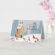Style vintage, carte de vacances rustique avec maison antique dans une prairie enneigée. Un renard curieux est venu enquêter sur la neige nouvellement tombée et il y a des oiseaux qui mangent la dernière des baies rouges sur les buissons. A l'intérieur, un fière bécasse se tient avec son pied près d'un arbre. Personnalisez avec un message différent si vous le souhaitez et incluez vos noms et l'année. Un renard rouge se trouve en haut et regarde vers l'arrière de la carte, où vous verrez deux oiseaux sucrés qui ont fini les baies !
