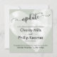 Cette carte distinctive pourrait être la meilleure façon d'annoncer que votre date de mariage a été changée. L'arrière - plan a été recouvert d'un joli vert sage qui peut être changé à n'importe quelle couleur. Superposition qui est un coeur partiellement opaque avec une surface vintage peinte en aquarelle blanche qui permet à votre couleur arrière - plan de se montrer à travers. J'ai utilisé une police moderne distinctive avec des accents tourbillonnants pour créer un graphique représentant le mot "mise à jour" qui est positionné en haut, assez grand. Utilisez les champs modèle pour ajouter vos informations personnelles et mettre à jour le message d'espace réservé si nécessaire. Je suis heureux d'aider à la personnalisation si vous avez besoin d'aide. // 57 //