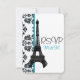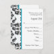 Cartes de mariages rsvp à thème français, à thème parisien, avec une bordure florale damassée noire et blanche vintage, design imprimé couleur bleu turquoise et la tour Eiffel à l'arrière. Ajoutez les initiales de la mariée et du marié en bleu turquoise. Conçu par Chrissy H. Studios, LLC. Tous droits réservés.