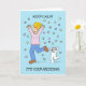 Illustration simple d'une femme blonde aux cheveux et d'un chat blanc courant à travers des confettis dans une panique. L'image est placée contre un arrière - plan de couleur bleu pâle. Une carte de plaisir à envoyer à toute mariée qui commence à paniquer sur ses arrangements mariages !