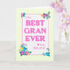 Une jolie carte de Fête des Mères pour la MEILLEURE GRAN JAMAIS. Le design a un chèque jaune en vichy bordure autour des mots, "Au MEILLEUR GRAN JAMAIS de nous deux", en lettres rose magenta sur un arrière - plan blanc légèrement texturé. Il y a des grappes lumineuses de fleurs multicolores dans les coins et un petit coeur rose magenta. Le message intérieur peut être customisé ou supprimé si vous le souhaitez.