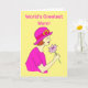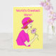 Illustration d'une femme portant un chapeau rose et une robe et tenant une fleur rose. Le message indique « Meilleure Maman du Monde » et à l'intérieur « Bonne Fête des Mères ». Modifiez facilement le texte du modèle pour personnaliser cette carte. Merci de consulter mes créations.
