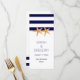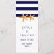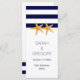 Carte de menu de mariage marine moderne bleu, rayures blanches étoiles de mer qui affiche une paire d'étoiles de mer, un groupe blanc avec contour or et un motif rayé bleu et blanc.