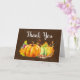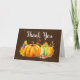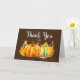 Un carte de remerciements avec un message que vous pouvez personnaliser à l'intérieur. Conçu avec une aquarelle illustrant les citrouilles, les glands, les champignons et les feuilles d'automne saisonnières. Arrière - plan d'aquarelle brun foncé.