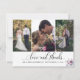 carte de remerciements mariage avec texte de calligraphie orné avec "amour et merci" et espace pour 3 photos. Orné d'un bouquet de rose rose, et de fleurs d'aquarelle bleue pour assortir le faire-part de mariage et RSVP. Espace pour écrire votre message personnel sur le dos. Personnalisez avec votre nom et votre date.