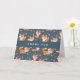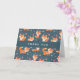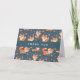 Carte de remerciements avec un motif fait de renards orange mignons et heureux. Arrière - plan vert foncé. Des petits champignons parsemèrent.