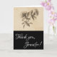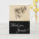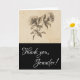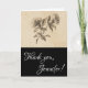 Cette élégante carte de remerciement comporte le message "Merci" sur le devant, ainsi qu'un nom de destinataire personnalisé. Il présente également une représentation de fleurs de style vintage. L'intérieur comporte un message de remerciement modifiable, ou il peut être effacé et laissé vide si un message doit être écrit à la main à la place. Une carte de remerciements comme celle-ci pourrait être utilisée pour express la gratitude pour quelque chose que quelqu'un a fait.