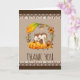 Une carte de remerciement pour une soirée, parfaite pour un remerciement après Thanksgiving. Conçue avec un tamia mignon debout derrière des citrouilles aquarelles orange. Une couronne de feuillage les entoure avec une feuille de chêne et des fleurs orange ainsi que d'autres brindilles et feuilles. Le fond est une image numérique d'une texture de papier rugueux.