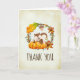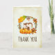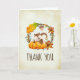 Une carte de remerciement pour une soirée, parfaite pour un remerciement après la fête de Thanksgiving. Conçue avec un tamia mignon debout derrière des citrouilles aquarelles orange. Une couronne de feuillage les entoure avec une feuille de chêne et des fleurs orange ainsi que d'autres brindilles et feuilles. Le fond est un parchemin faux-vintage de couleur crème, avec un aspect vieilli rugueux. Message personnalisé à l'intérieur.
