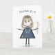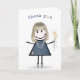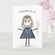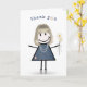 Jolie figurine en bâton avec cheveux, basket, robe denim bleue, collier de perle, et bouquet de marguerite pour vous remercier. La couleur arrière - plan blanche peut être changée. Tout le texte peut être modifié.