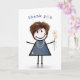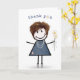 Jolie figurine en bâton avec cheveux, basket, robe denim bleue, collier de perle, et bouquet de marguerite pour vous remercier. La couleur arrière - plan blanche peut être changée. Tout le texte peut être modifié.