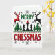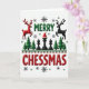 This digital art shows a playful holiday card with a clever pun "MERRY CHESSMAS" in bold, glowing green and red letters. The background is white with lots of red and green colors; it feels like a fun winter scene. There are tiny fir trees and black chess pieces, and even a king or queen chess piece wearing a cute red Santa hat. Two reindeer dance above, one red and one black, making a cool pattern.
