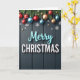 This Christmas card captures the holiday spirit in a beautifully elegant way. The main focus is the words "Merry Christmas" in a stunning two-part display. "Merry" is written in a shimmering aqua blue script, while "Christmas" is in bold white letters with a hint of crimson. These words are the center of attention on the card. The background looks like a dark gray wooden board, giving a rustic but modern feel. Above the words, there's a lovely garland made of green fir branches with colorful ornaments hanging down. The ornaments are in shades of red, gold, and teal blue, some with stripes or shiny finishes. White snowflakes add to the wintry theme, giving a cozy feeling to the scene. Soft lighting enhances the metallic ornaments and the text, creating a sense of joy and holiday spirit. This card is perfect for sending warm wishes during the holiday season. 🎅🏼🎄🎁 Share the holiday cheer with this beautifully crafted design!