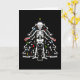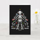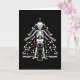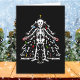 This Christmas tree skeleton is decorated with bones, ornaments, Christmas lights, candy canes, snowflakes for a holiday greeting.