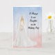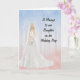 Message à la fille sur sa carte du jour de mariage, de ses parents. Le design est une belle mariée dans sa robe avec un voile et des fleurs, avec un arrière - plan de bois magique. Tous les mots sur la carte peuvent être changés. Merci à Design Cuts et Creative Fabrica pour certains des éléments du design.