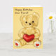 Carte d'anniversaire mignonne pour ami avec une illustration numérique d'un ours en peluche jaune et moelleux tenant un coeur rouge et le texte personnalisable "Joyeux anniversaire, cher ami!". Cette carte d'anniversaire d'ours en peluche plaira à quelqu'un qui aime les nounours et les illustrations mignonnes.