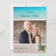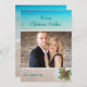 Carte photo de Noël de plage avec accueil personnalisé et signature sur le devant des cartes à plat. Ajoutez une photo horizontale (paysage) de famille, de couple ou d'une personne seule sur une image arrière - plan de mer avec de l'eau tropicale bleue et du sable de plage. L'image de Starfish, holly et dollar de sable orne le coin inférieur pour mettre en valeur le thème tropical.