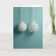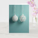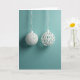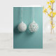 A beautiful holiday card shows two white ornaments 🎄 on a soft teal background. The left ornament has a detailed lattice pattern, like a fancy dessert, while the one on the right has smooth cutouts resembling cells. Both ornaments are a matte white color and cast soft shadows, making them look 3D. Thin white strings hold them up, making them seem like they're floating. This card is all about shapes, textures, and colors, creating a calm and elegant vibe for the holidays 🎅🏼. It's perfect for spreading some holiday cheer with its peaceful and artistic design!