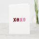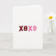 This card shows the simple message “XOXO” stretched across a white background. The four letters sit in a straight row, guiding your eyes from left to right. The first X and O are a deep maroon, giving the start a classic romantic feel. The second X and O switch to a bright fuchsia, adding a fun pop of color without feeling busy. Both O’s are shaped a bit like smooth eggs, and each one has small white heart cutouts inside—two hearts in the maroon O and five hearts in the fuchsia O. The “XOXO” text looks like thick, modern lettering, centered on the front so it’s the first thing you notice. It feels meaningful because it says “hugs and kisses” in a simple way, and the hearts make the affection easy to see 🥰❤️.