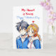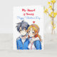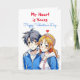 Une carte Heureuse Sainte-Valentin douce représentant un couple de garçons et de filles anime en bleu et rouge. Au verso se trouve une page de coloriage où vous pouvez personnaliser les noms. Carte Saint-Valentin pour lui.