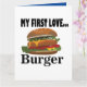 Carte de vœux My First Love Burger conçue par Nisha Prabhu. Illustrant une délicieuse illustration numérique graphique de burger avec une typographie amusante "Mon premier amour... Burger". Envoyez un message délicieusement charmant avec cette carte de vœux My First Love Burger ! Que vous célébriez une occasion spéciale ou que vous souhaitiez simplement égayer la journée de quelqu'un, cette carte amusante et fantaisiste est sûre de leur apporter un sourire sur le visage. Avec un design de burger ludique qui rend hommage à la nourriture réconfortante préférée de tous, cette carte de vœux est parfaite pour les amateurs de burgers et les amateurs de nourriture. Partagez votre amour pour les burgers et répandez la joie avec cette carte unique et savoureuse. Faites savoir à votre destinataire qu'il est spécial avec une touche d'amour pour les burgers et un message sincère à l'intérieur de cette carte