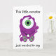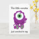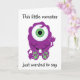 Monstre adorable de cyclopes avec un grand oeil partiellement couvert par une boucle égarée et avec une dent de fortune dans les smailes de Halloween et les vagues pourpres et verts bonjour. Un cadeau mignon et de fête.