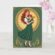 This design shows a woman with cascading auburn hair holding a small, winged child close against her chest, their faces turned toward each other with a tender, trusting look. She wears a deep emerald dress over a white blouse, and her blue eyes and slight smile give the scene a gentle, affectionate tone 💚. The child echoes her fiery curls and nestles in her arms as if settling into a safe embrace, with soft golden wings catching the light. Behind them, a dark green field sets a calm stage, while a glowing gold circle surrounds the pair like a halo, warming their skin tones and hair. In the lower corners, delicate gold floral motifs curl upward, adding ornate detail that frames the figures without crowding them ☘️. Any text would sit best near the top in small gold lettering, with a second line near the bottom in matching gold to balance the composition. The gold circle remains centered behind their heads, and the corner florals stay anchored low left and low right, like gilded vines against the green backdrop.