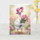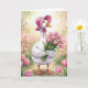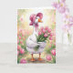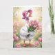 A white goose holds a vibrant bouquet of pink tulips amidst a picturesque spring garden, brought to life through a stunning watercolor effect.