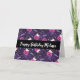 Carte d'anniversaire avec un motif adorable sur le thème d'Halloween. Des chats avec des chapeaux de sorcières, assis sur des citrouilles roses avec des toiles d'araignées violettes en arrière-plan.