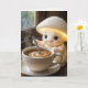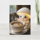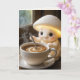 Une jolie créature aux allures de champignons avec un casquette brillant se tient à côté d'une tasse de café vapeur, en la remuant avec une cuillère. Tout le texte peut être modifié.