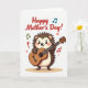 This card features a cute, spiky-backed little creature with rosy cheeks and a wide, open-mouthed smile as it strums an acoustic guitar, as if serenading someone it adores ❤️. Its bright eyes and forward-leaning posture suggest a friendly, affectionate performance, like a sweet song shared just for Mom. The creature is colored in warm browns and soft creams, with small paws wrapped around the neck and body of a rich reddish-brown guitar. Near the top, the words “Happy Mother’s Day!” appear in red lettering, arcing above the character so the greeting is the first thing you notice. Around the scene, scattered music notes float in olive green, teal, and deep red, adding motion like the melody is drifting through the air. Small red heart shapes mingle with the notes, hinting at tender closeness without needing any extra words 🌼. Everything sits on a plain white background that keeps the focus on the character and the floating details. The top greeting is red, and the notes and hearts are spaced around the smiling guitarist in green, teal, and red accents.