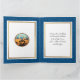 The art is set against a beautiful blue and gold gradient sky, evoking the quiet wonder of that holy night. The card is framed with a striking blue border adorned with delicate snowflakes, adding a festive winter touch. The top message reads, "Wishing you a Merry Christmas and Happy New Year" in a decorative font, while the bottom includes a customizable "Christmas Blessings from the [Your Family Name] Family." Ideal for: Sending heartfelt religious holiday greetings to family and friends.