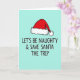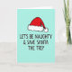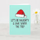 This funny holiday card has a red Santa hat on top with a white fluffy trim and a little ball on it drawn in a cool, aqua-blue background. Under the hat, big letters say, "LET'S BE NAUGHTY & SAVE SANTA THE TRIP." The text matches the hat's handmade style and gives the card a cheeky, grown-up twist to the usual Christmas stuff. The whole card feels playful and light, with the aqua color balancing out the bold red and black colors. It mixes traditional holiday stuff with a modern, humorous message that makes you smile. 🎅🏼🎄🎁.