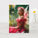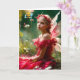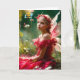 Une jeune fée magnifique avec des ailes délicates et une robe rouge est assise au milieu d'un jardin luxuriant entouré de fleurs et de feuilles. Elle porte une couronne de fleurs et regarde pensivement au loin, baignée dans une lumière douce et naturelle. Elle a l'air si triste qu'une abeille qui passe éclate en larmes.